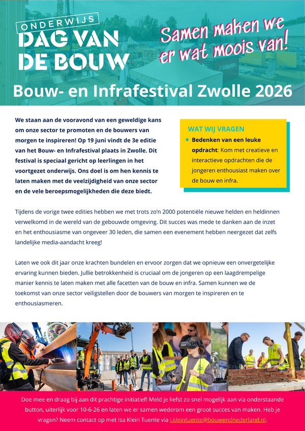 Leden Onderwijsdag van de Bouw | Bouw- en Infrafestival Zwollei.kleintuente@bouwendnederland.nlhttps://www.aanmelder.nl/175201/subscribe