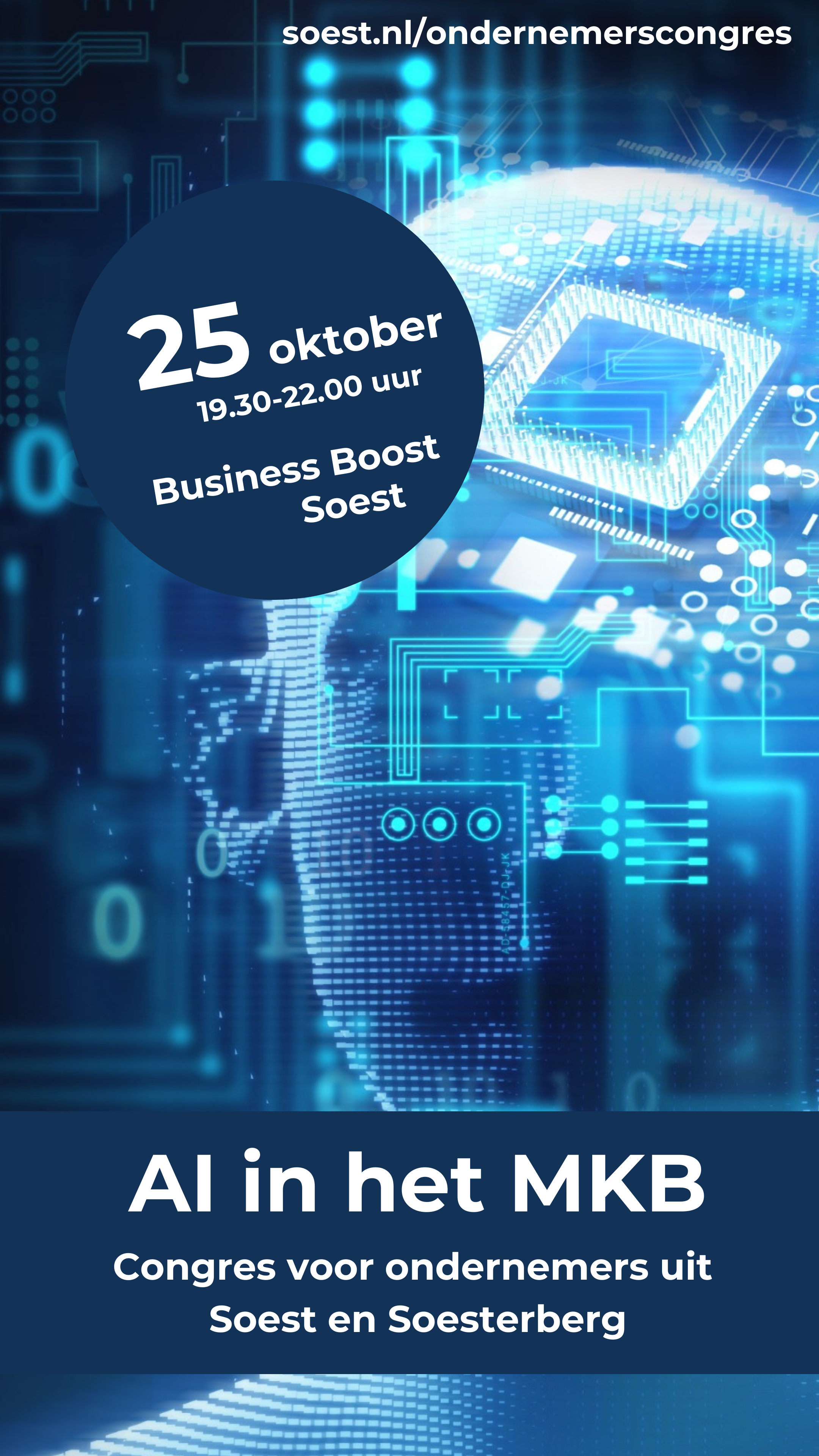 Ondernemerscongres Business Boost Soest op 25 oktober aanstaande is een jaarlijks terugkerend evenement voor Soester ondernemers, georganiseerd door Soester Zakenkring en gemeente Soest. Dit jaar is het thema “AI in het MKB” en komt futurist en internationaal topspreker Richard van Hooijdonk de kansen en bedreigingen toelichten van de nieuwste trends en toepassingen van AI. Wilt u weten hoe u als ondernemer daarop kunt inspelen? Kom dan 25 oktober naar Business Boost Soest. Voor het programma en aanmelding kunt u meer lezen op soest.nl/ondernemerscongres.