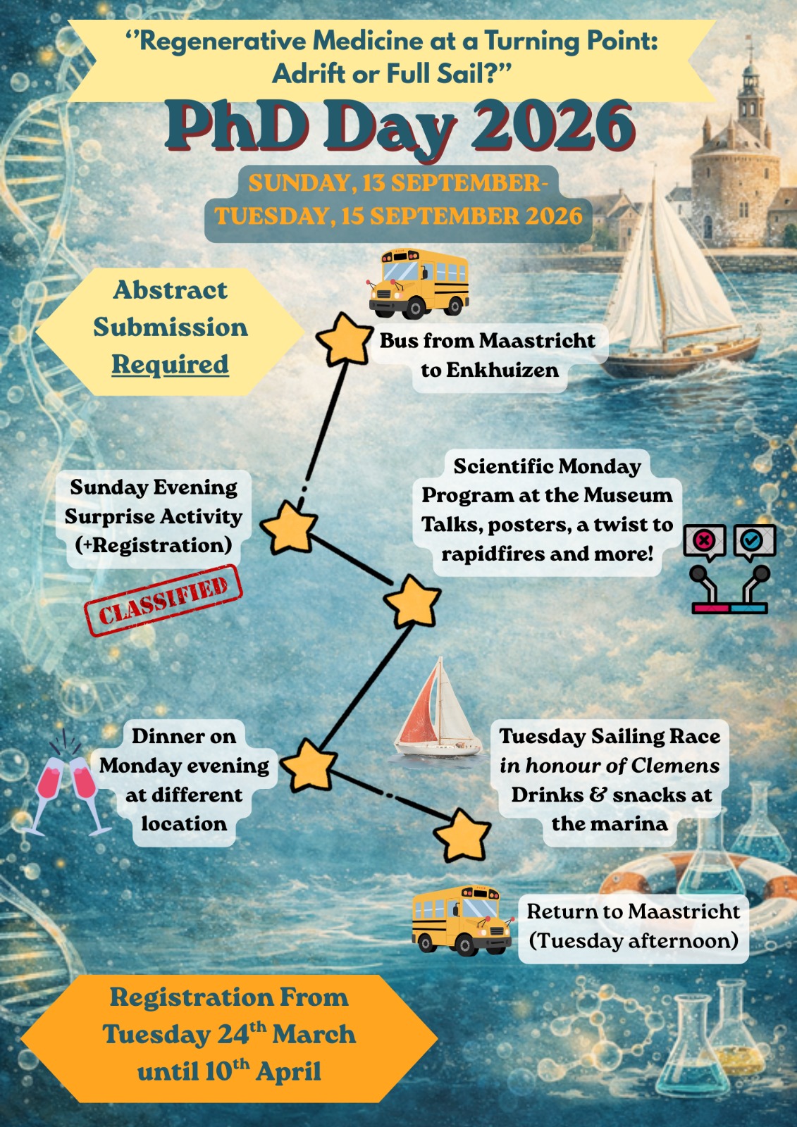 September 13th sets the stage with an opening talk that starts off the theme on the evolution of regenerative medicine. The depart from Maastricht by bus is planned for around lunchtime.